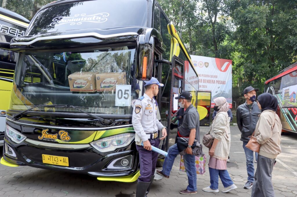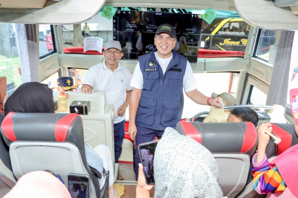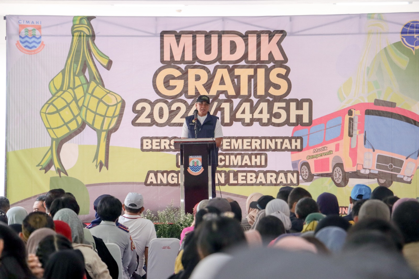 PortalNusa.Id, Cimahi | Penjabat (Pj) Wali Kota Cimahi Dicky Saromi didampingi Sekretaris Daerah Kota Cimahi Dikdik S. Nugrahawan melepas rombongan pesesrta Mudik Gratis Lebaran Tahun 1445 Hijriah/2024 yang diprakarsai oleh Dinas Perhubungan Kota Cimahi, Sabtu (06/04). Pelepasan peserta Mudik Gratis dilakukan di selasar Gedung B Kantor Pemerintahan Kota Cimahi.