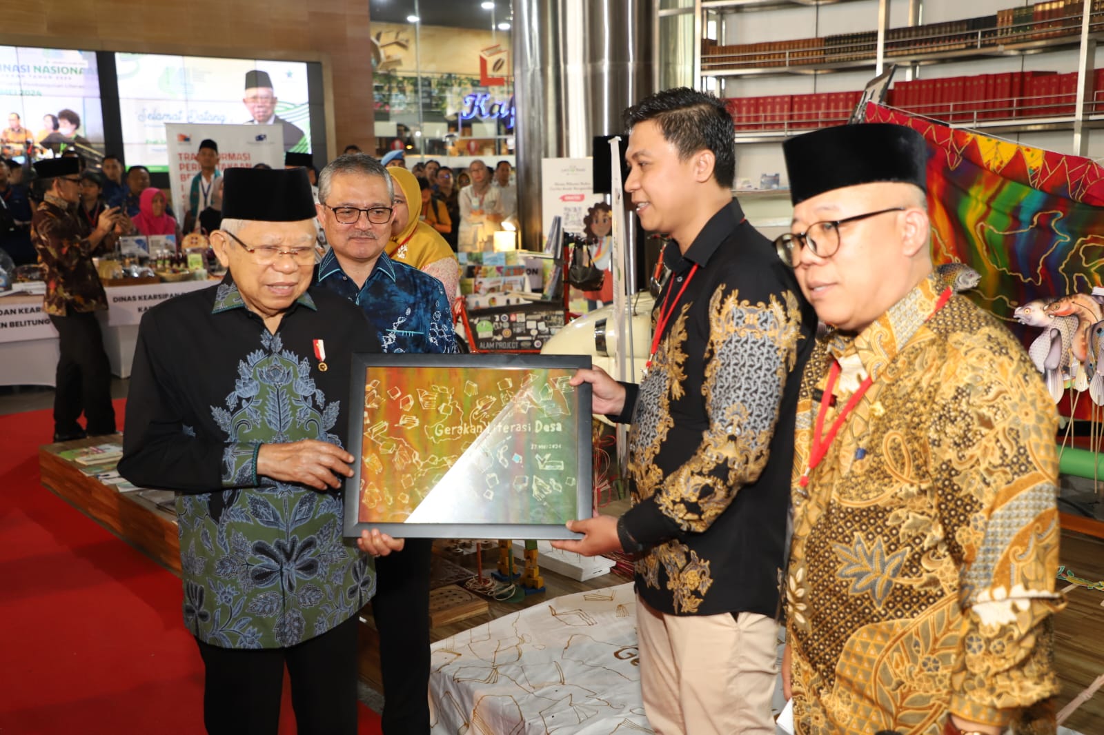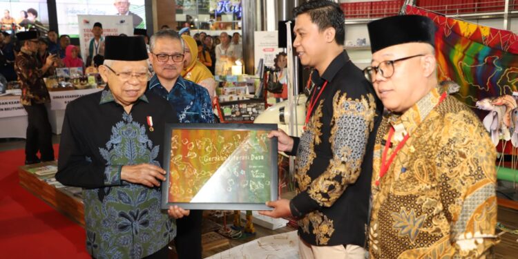 PortalNusa.Id, Jakarta | Apep Saepudin sebagai perwakilan dari Forum TBM menyerahkan karya berupa batik semprot dari salah satu Taman Bacaan Masyarakat (TBM) yang mengikuti Pameran Literasi Nusantara di Perpustakaan Nasional Indonesia kepada Wakil Presiden Republik Indonesia Bapak Ma’ruf Amin, Jumat (17/05).