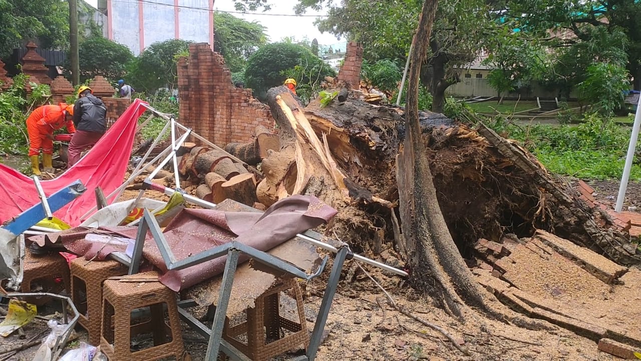 Portalnusa.id – Sepasang suami istri yang sedang berjualan nasi rawon di depan Gedung Kesenian Rarasantang Komplek Stadion Bima menjadi korban pohon besar yang tumbang.