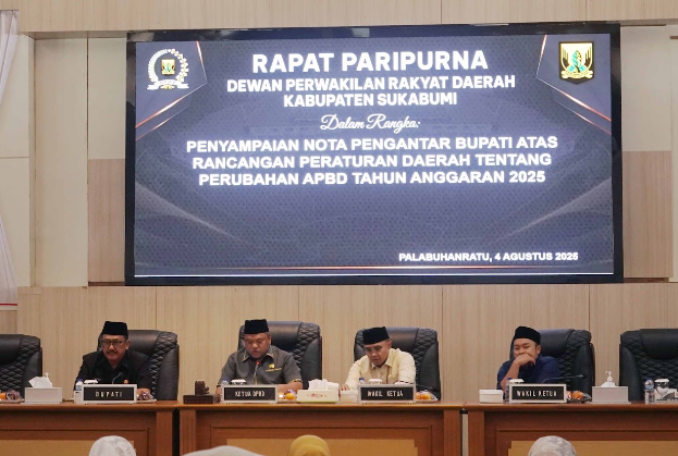 PortalNusa.ID, Sukabumi – Dewan Perwakilan Rakyat Daerah (DPRD) Kabupaten Sukabumi menggelar Rapat Paripurna ke-28 Tahun Sidang 2025 dengan agenda Penyampaian Nota Pengantar Bupati atas Rancangan Peraturan Daerah tentang Perubahan Anggaran Pendapatan dan Belanja Daerah (APBD) Tahun Anggaran 2025. Rapat digelar di Ruang Rapat Utama DPRD Kabupaten Sukabumi, Senin (4/8/2025).